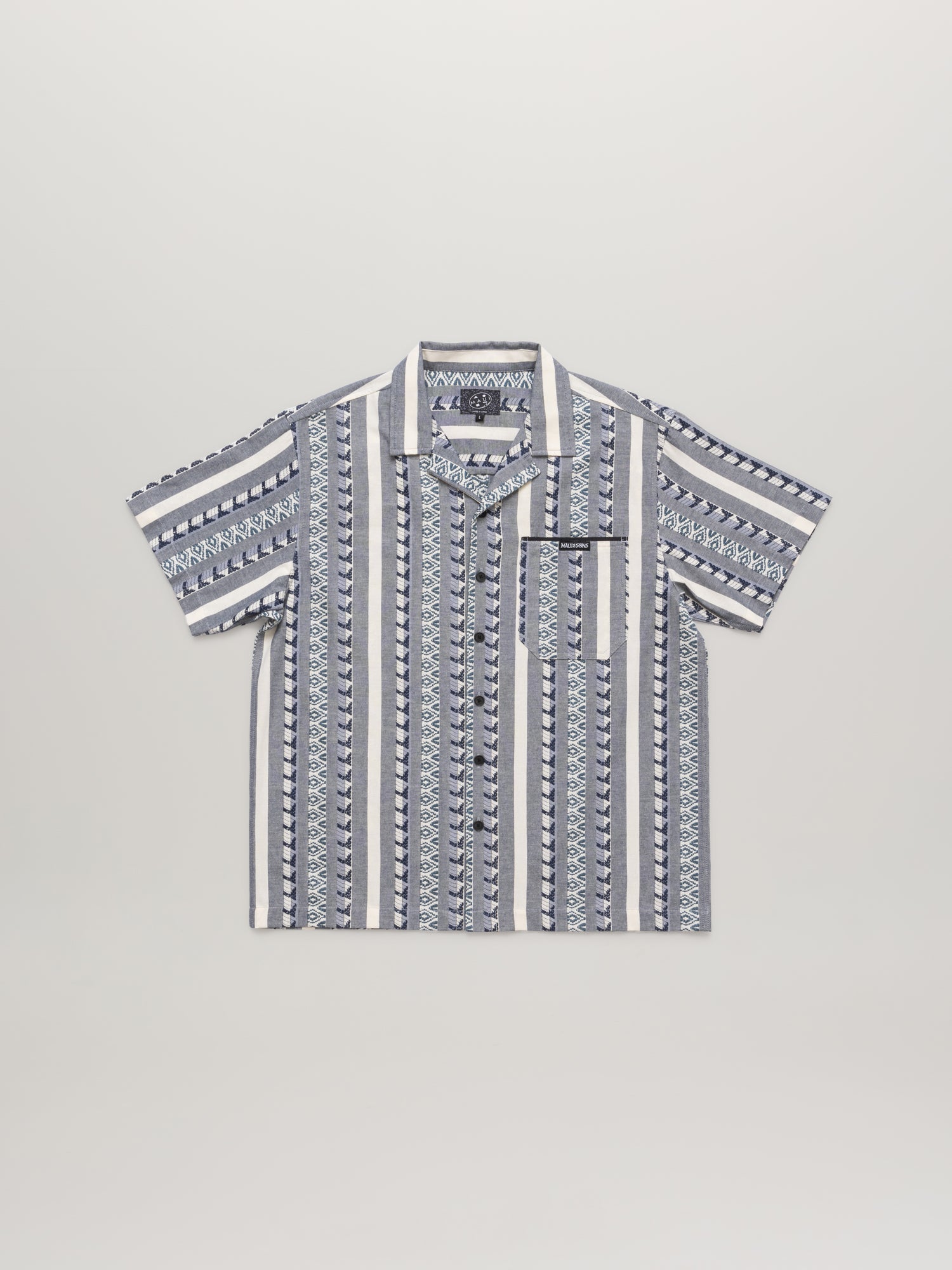 Relaxed-fit cotton jacquard-woven camp shirt. Features bold geometric striping for a distinct textured look.