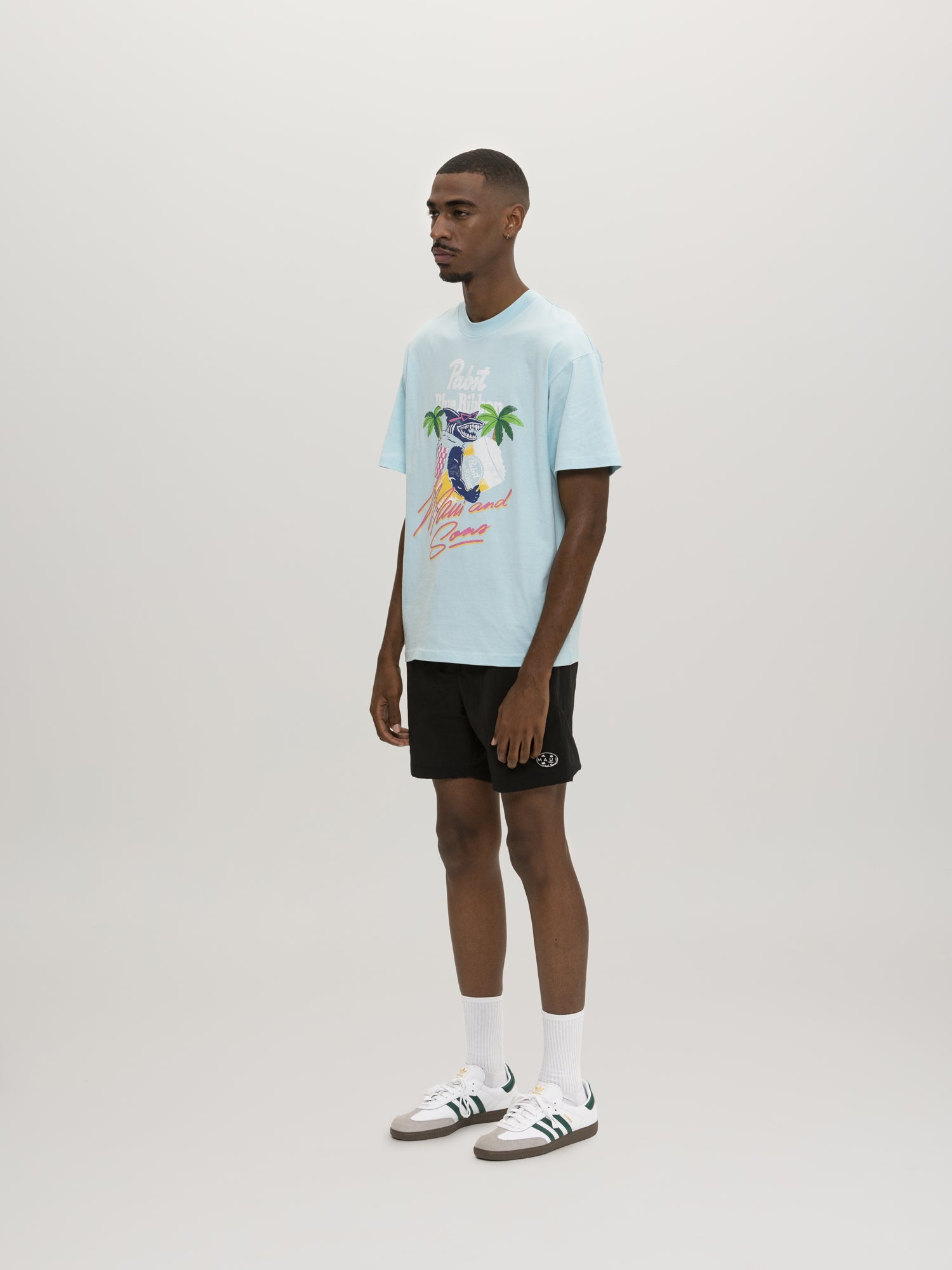 Don't worry, the shark only bites if you try to take his beer. The Pabst & Maui collab continues with our shark vest short sleeve crewneck light blue graphic tee. Sharkman approved.
